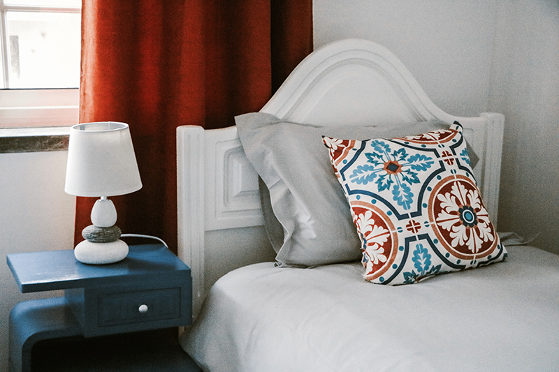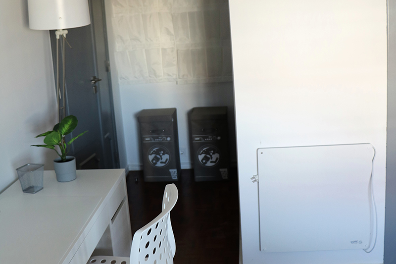 This is a big single suite room on the first floor of Parede Cocoon. It has an individual bed with a duvet, double fitted wardrobe with hangers and shelves for sweaters, a big window with a fantastic view for the front of the house next to the study area, storage for shoes and dirty laundry. The room has a wall heater and a private bathroom “Tiber River” with window and shares the kitchen on the ground floor where there’s individual lockers and storage.